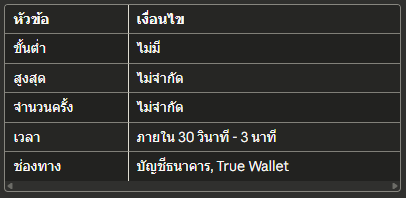 หัวข้อเงื่อนไขขั้นต่ำไม่มีสูงสุดไม่จำกัดจำนวนครั้งไม่จำกัดเวลาภายใน 30 วินาที - 3 นาทีช่องทางบัญชีธนาคาร, True Wallet
