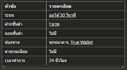 หัวข้อรายละเอียดระบบออโต้ 30 วินาทีฝากขั้นต่ำ1 บาทถอนขั้นต่ำไม่มีช่องทางทุกธนาคาร, True Walletค่าธรรมเนียมไม่มีเวลาทำการ24 ชั่วโมง