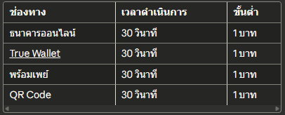ช่องทางเวลาดำเนินการขั้นต่ำธนาคารออนไลน์30 วินาที1 บาทTrue Wallet30 วินาที1 บาทพร้อมเพย์30 วินาที1 บาทQR Code30 วินาที1 บาท