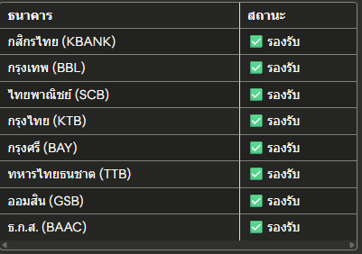 ธนาคารสถานะกสิกรไทย (KBANK)✅ รองรับกรุงเทพ (BBL)✅ รองรับไทยพาณิชย์ (SCB)✅ รองรับกรุงไทย (KTB)✅ รองรับกรุงศรี (BAY)✅ รองรับทหารไทยธนชาต (TTB)✅ รองรับออมสิน (GSB)✅ รองรับธ.ก.ส. (BAAC)✅ รองรับ