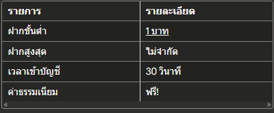 รายการรายละเอียดฝากขั้นต่ำ1 บาทฝากสูงสุดไม่จำกัดเวลาเข้าบัญชี30 วินาทีค่าธรรมเนียมฟรี!