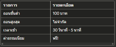 รายการรายละเอียดถอนขั้นต่ำ100 บาทถอนสูงสุดไม่จำกัดเวลาเข้า30 วินาที - 5 นาทีค่าธรรมเนียมฟรี!