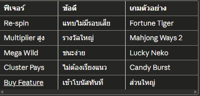 ฟีเจอร์ข้อดีเกมตัวอย่างRe-spinแทบไม่มีรอบเสียFortune TigerMultiplier สูงรางวัลใหญ่Mahjong Ways 2Mega Wildชนะง่ายLucky NekoCluster Paysไม่ต้องเรียงแนวCandy BurstBuy Featureเข้าโบนัสทันทีส่วนใหญ่
