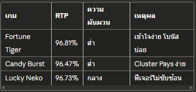 เกมRTPความผันผวนเหตุผลFortune Tiger96.81%ต่ำเข้าใจง่าย โบนัสบ่อยCandy Burst96.47%ต่ำCluster Pays ง่ายLucky Neko96.73%กลางฟีเจอร์ไม่ซับซ้อน