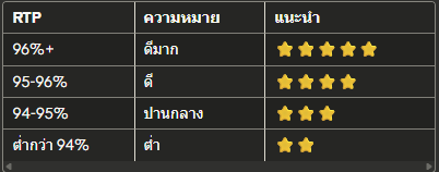 RTPความหมายแนะนำ96%+ดีมาก⭐⭐⭐⭐⭐95-96%ดี⭐⭐⭐⭐94-95%ปานกลาง⭐⭐⭐ต่ำกว่า 94%ต่ำ⭐⭐