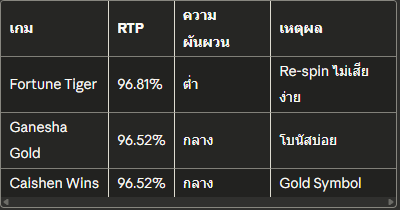 เกมRTPความผันผวนเหตุผลFortune Tiger96.81%ต่ำRe-spin ไม่เสียง่ายGanesha Gold96.52%กลางโบนัสบ่อยCaishen Wins96.52%กลางGold Symbol