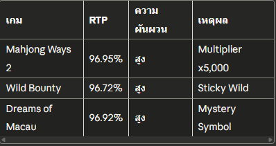 เกมRTPความผันผวนเหตุผลMahjong Ways 296.95%สูงMultiplier x5,000Wild Bounty96.72%สูงSticky WildDreams of Macau96.92%สูงMystery Symbol