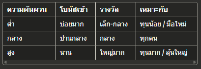 ความผันผวนโบนัสเข้ารางวัลเหมาะกับต่ำบ่อยมากเล็ก-กลางทุนน้อย / มือใหม่กลางปานกลางกลางทุกคนสูงนานใหญ่มากทุนมาก / ลุ้นใหญ่