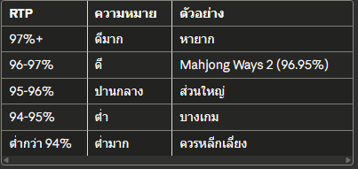 RTPความหมายตัวอย่าง97%+ดีมากหายาก96-97%ดีMahjong Ways 2 (96.95%)95-96%ปานกลางส่วนใหญ่94-95%ต่ำบางเกมต่ำกว่า 94%ต่ำมากควรหลีกเลี่ยง