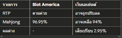 รายการSlot Americaเว็บเอเย่นต์RTPตามค่ายอาจถูกปรับลดMahjong96.95%อาจเหลือ 94%ผลต่าง-เสียเปรียบ 2.95%