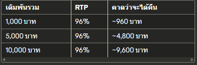 เดิมพันรวมRTPคาดว่าจะได้คืน1,000 บาท96%~960 บาท5,000 บาท96%~4,800 บาท10,000 บาท96%~9,600 บาท