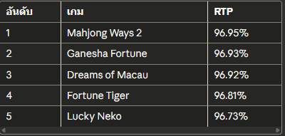 อันดับเกมRTP1Mahjong Ways 296.95%2Ganesha Fortune96.93%3Dreams of Macau96.92%4Fortune Tiger96.81%5Lucky Neko96.73%