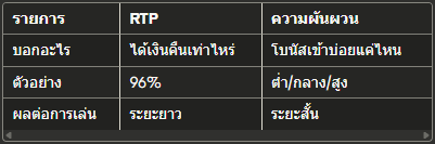 รายการRTPความผันผวนบอกอะไรได้เงินคืนเท่าไหร่โบนัสเข้าบ่อยแค่ไหนตัวอย่าง96%ต่ำ/กลาง/สูงผลต่อการเล่นระยะยาวระยะสั้น