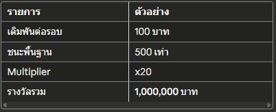 รายการตัวอย่างเดิมพันต่อรอบ100 บาทชนะพื้นฐาน500 เท่าMultiplierx20รางวัลรวม1,000,000 บาท