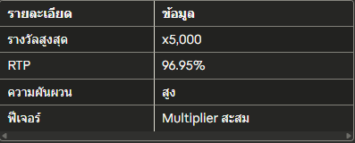 รายละเอียดข้อมูลรางวัลสูงสุดx5,000RTP96.95%ความผันผวนสูงฟีเจอร์Multiplier สะสม