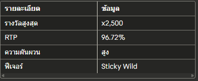 รายละเอียดข้อมูลรางวัลสูงสุดx2,500RTP96.72%ความผันผวนสูงฟีเจอร์Sticky Wild