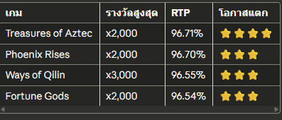 เกมรางวัลสูงสุดRTPโอกาสแตกTreasures of Aztecx2,00096.71%⭐⭐⭐⭐Phoenix Risesx2,00096.70%⭐⭐⭐Ways of Qilinx3,00096.55%⭐⭐⭐Fortune Godsx2,00096.54%⭐⭐⭐
