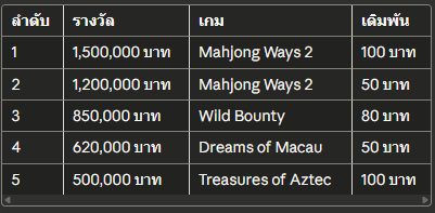 ลำดับรางวัลเกมเดิมพัน11,500,000 บาทMahjong Ways 2100 บาท21,200,000 บาทMahjong Ways 250 บาท3850,000 บาทWild Bounty80 บาท4620,000 บาทDreams of Macau50 บาท5500,000 บาทTreasures of Aztec100 บาท
