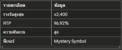 รายละเอียดข้อมูลรางวัลสูงสุดx2,400RTP96.92%ความผันผวนสูงฟีเจอร์Mystery Symbol