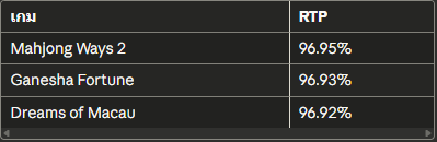 เกมRTPMahjong Ways 296.95%Ganesha Fortune96.93%Dreams of Macau96.92%