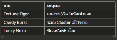 เกมเหตุผลFortune Tigerเกมง่าย 3 รีล โบนัสเข้าบ่อยCandy Burstระบบ Cluster เข้าใจง่ายLucky Nekoฟีเจอร์ไม่ซับซ้อน