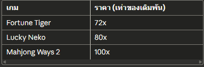 เกมราคา (เท่าของเดิมพัน)Fortune Tiger72xLucky Neko80xMahjong Ways 2100x