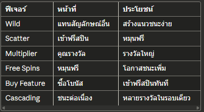 ฟีเจอร์หน้าที่ประโยชน์Wildแทนสัญลักษณ์อื่นสร้างแนวชนะง่ายScatterเข้าฟรีสปินหมุนฟรีMultiplierคูณรางวัลรางวัลใหญ่Free Spinsหมุนฟรีโอกาสชนะเพิ่มBuy Featureซื้อโบนัสเข้าฟรีสปินทันทีCascadingชนะต่อเนื่องหลายรางวัลในรอบเดียว