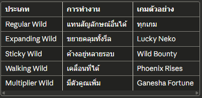 ประเภทการทำงานเกมตัวอย่างRegular Wildแทนสัญลักษณ์อื่นได้ทุกเกมExpanding Wildขยายคลุมทั้งรีลLucky NekoSticky Wildค้างอยู่หลายรอบWild BountyWalking Wildเคลื่อนที่ได้Phoenix RisesMultiplier Wildมีตัวคูณเพิ่มGanesha Fortune