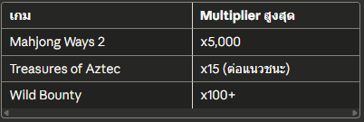 เกมMultiplier สูงสุดMahjong Ways 2x5,000Treasures of Aztecx15 (ต่อแนวชนะ)Wild Bountyx100+