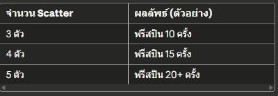 จำนวน Scatterผลลัพธ์ (ตัวอย่าง)3 ตัวฟรีสปิน 10 ครั้ง4 ตัวฟรีสปิน 15 ครั้ง5 ตัวฟรีสปิน 20+ ครั้ง