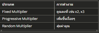 ประเภทการทำงานFixed Multiplierคูณคงที่ เช่น x2, x3Progressive Multiplierเพิ่มขึ้นเรื่อยๆRandom Multiplierสุ่มค่าคูณ