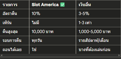 รายการSlot America ✅เว็บอื่นอัตราคืน10%3-5%เทิร์นไม่มี1-3 เท่าคืนสูงสุด10,000 บาท1,000-5,000 บาทรอบการคืนทุกวันรายสัปดาห์/เดือนถอนได้เลยใช่บางที่ต้องเล่นก่อน
