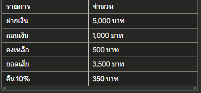 รายการจำนวนฝากเงิน5,000 บาทถอนเงิน1,000 บาทคงเหลือ500 บาทยอดเสีย3,500 บาทคืน 10%350 บาท