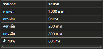รายการจำนวนฝากเงิน1,000 บาทถอนเงิน0 บาทคงเหลือ200 บาทยอดเสีย800 บาทคืน 10%80 บาท