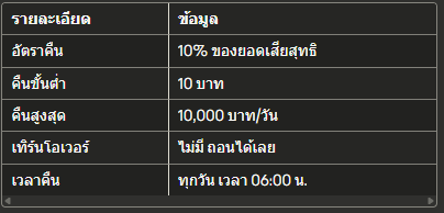 รายละเอียดข้อมูลอัตราคืน10% ของยอดเสียสุทธิคืนขั้นต่ำ10 บาทคืนสูงสุด10,000 บาท/วันเทิร์นโอเวอร์ไม่มี ถอนได้เลยเวลาคืนทุกวัน เวลา 06:00 น.