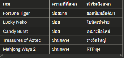 เกมความถี่ที่แจกทำไมถึงแจกFortune Tigerบ่อยมากยอดนิยมอันดับ 1Lucky Nekoบ่อยโบนัสเข้าง่ายCandy Burstบ่อยเหมาะมือใหม่Treasures of Aztecปานกลางรางวัลใหญ่Mahjong Ways 2ปานกลางRTP สูง