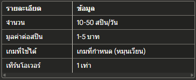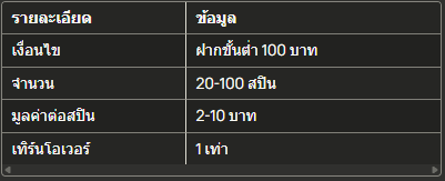 รายละเอียดข้อมูลจำนวน10-50 สปิน/วันมูลค่าต่อสปิน1-5 บาทเกมที่ใช้ได้เกมที่กำหนด (หมุนเวียน)เทิร์นโอเวอร์1 เท่า