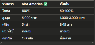 รายการSlot America ✅เว็บอื่นโบนัส100%50-100%สูงสุด5,000 บาท1,000-3,000 บาทเทิร์น5 เท่า8-15 เท่าเกมที่ใช้ทุกเกมบางเกมถอนได้ไม่จำกัดมีเพดาน