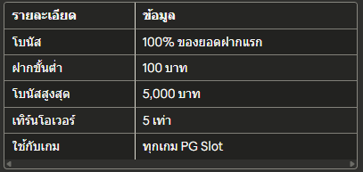 รายละเอียดข้อมูลโบนัส100% ของยอดฝากแรกฝากขั้นต่ำ100 บาทโบนัสสูงสุด5,000 บาทเทิร์นโอเวอร์5 เท่าใช้กับเกมทุกเกม PG Slot