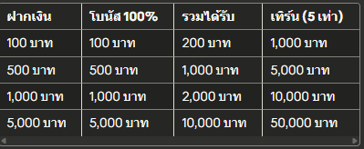 ฝากเงินโบนัส 100%รวมได้รับเทิร์น (5 เท่า)100 บาท100 บาท200 บาท1,000 บาท500 บาท500 บาท1,000 บาท5,000 บาท1,000 บาท1,000 บาท2,000 บาท10,000 บาท5,000 บาท5,000 บาท10,000 บาท50,000 บาท